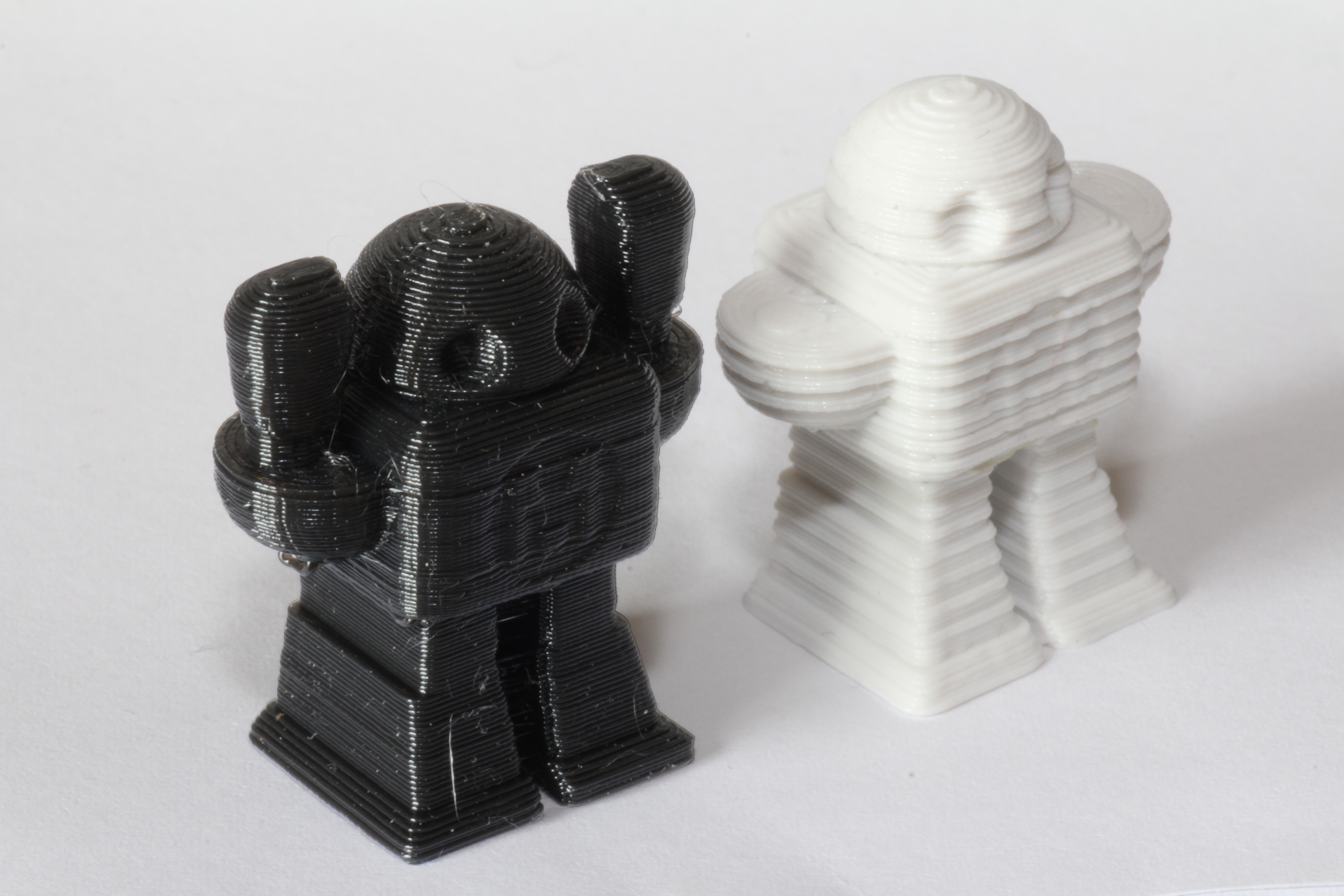 - The M8 threaded rod for the Z feeder is crap. Since the coupler between the Z motor and the rod is wobbly too, you'll get all sorts of inaccuracies in the Z feed, resulting in a inhomogeneous layer thickness and ugly side walls. The solution is to replace the M8 rod and its nuts with a TSR-Tr8x1.5 trapezoidal-thread spindle and matching nuts, thereby greatly increasing Z resolution. The picture with the robots again shows the difference (white: M8 rod, black: Tr8x1.5 rod). Note that you'll have to patch the firmware too since the slope of the thread is different.