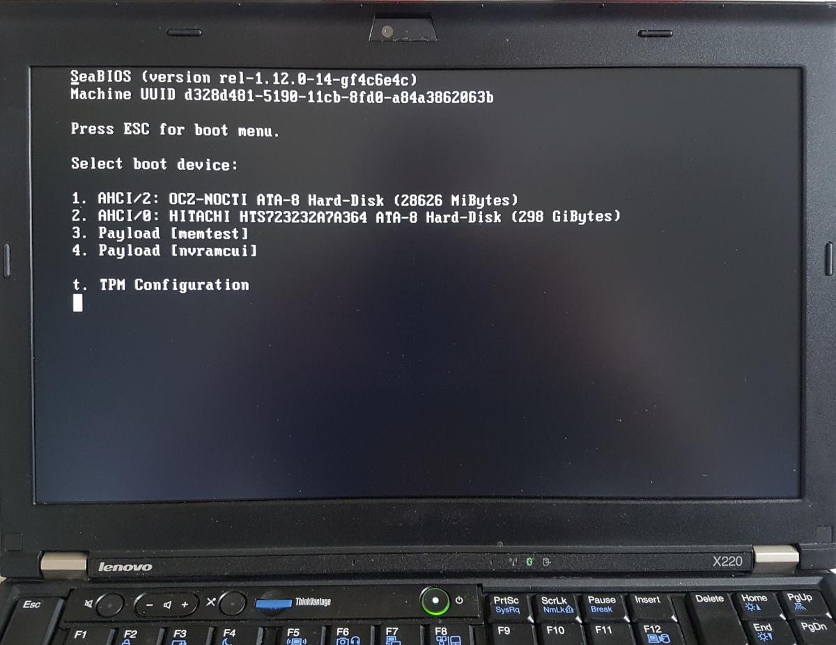 *** Important: Run 'make distclean' before switching boards *** Mainboard vendor (Lenovo) ---> Mainboard model (ThinkPad X220 Nitrocaster Full HD mod) ---> ROM chip size (8192 KB (8 MB)) ---> System Power State after Failure (S5 Soft Off) ---> (0x100000) Size of CBFS filesystem in ROM () fmap description file in fmd format