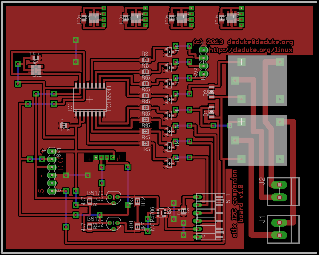 Dioder is a nice full RGB LED light strip sold by Ikea at a reasonable price. Unlike some other products Dioder offers very smooth color cycling and a continuous color control feature. Of course such a LED strip is only half as much fun if it's not computer controlled. Since it was going to be installed close to my Alix router, I decided to build an I2C interface to operate the LED strip. While I was at it, I threw in a couple of relays to switch heavier loads and a Sensirion SHT 21 temperature/humidity sensor (thanks again, megaR!) for good measure.