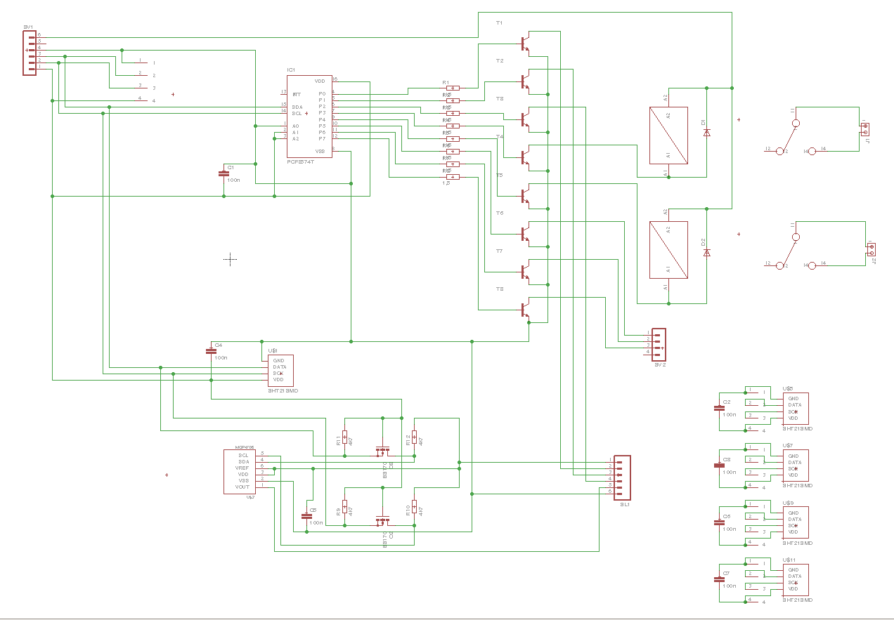 I use a PCF8574T I2C 8-bit I/O expander to simulate button presses on the LED controller and to toggle the relays. A MCP4706 I2C 8-bit DAC replaces the potentiometer to control the color. Since the whole I2C bus is 3.3 V but we need a 5 V reference for the DAC, a couple of FETs couple the 5 V-fed DAC to the I2C bus. The SHT 21 can be mounted onboard or on a small PCB connected by a 4-pin ribbon cable. Next to the LED control and the 2 relays there are 3 remaining I/O bits that can be used via a pin header.