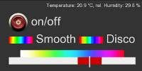The web interface has buttons for on/off, smooth color cycle or disco flashing, and a slider to manually set a color. Furthermore, it displays current temperature and humidity. I use i2cset to control the PCF8574T and the DAC and the sht21 module in recent kernels to read the temperature and humidity values. C wrapper programs take care of the privilege escalation from www-data (CGI) to root (i2cset).