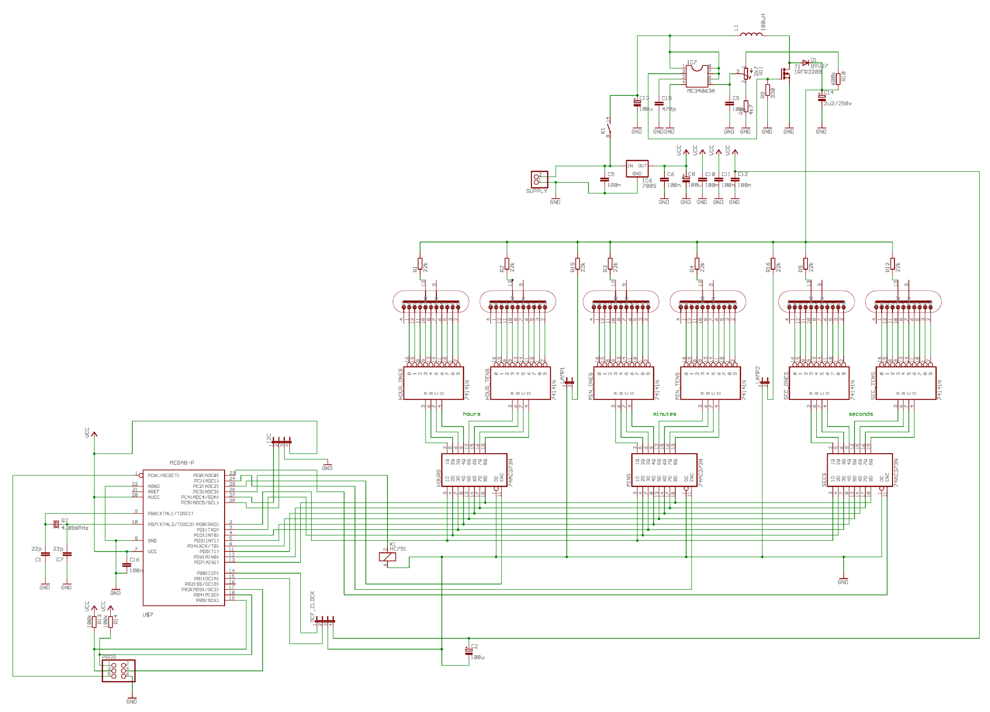 My design uses 6 ZM1210 Nixie tubes I bought from Ask Jan first! to display the time, date and temperature (not yet implemented). Everything is controlled by a cheap Atmel 4433 or Mega8 microcontroller. The μC is in-circuit programmable to allow easy software updates via the parallel port. All the other parts on the part list are standard, with the possible exception of the MC34063 used for the high voltage generation. I got mine from Reichelt in Germany. The HV is controllable by the μC via a small reed relay (optional) and if a Mega8 is used, the I2C bus is accessible with a pin header to add an temperature sensor like the LM92 for example. The display output to the tubes is going to three 74LS373 8bit latches which drive a 74141 for each Nixie. But probably it's easiest to just take a look at the schematic to get an idea.