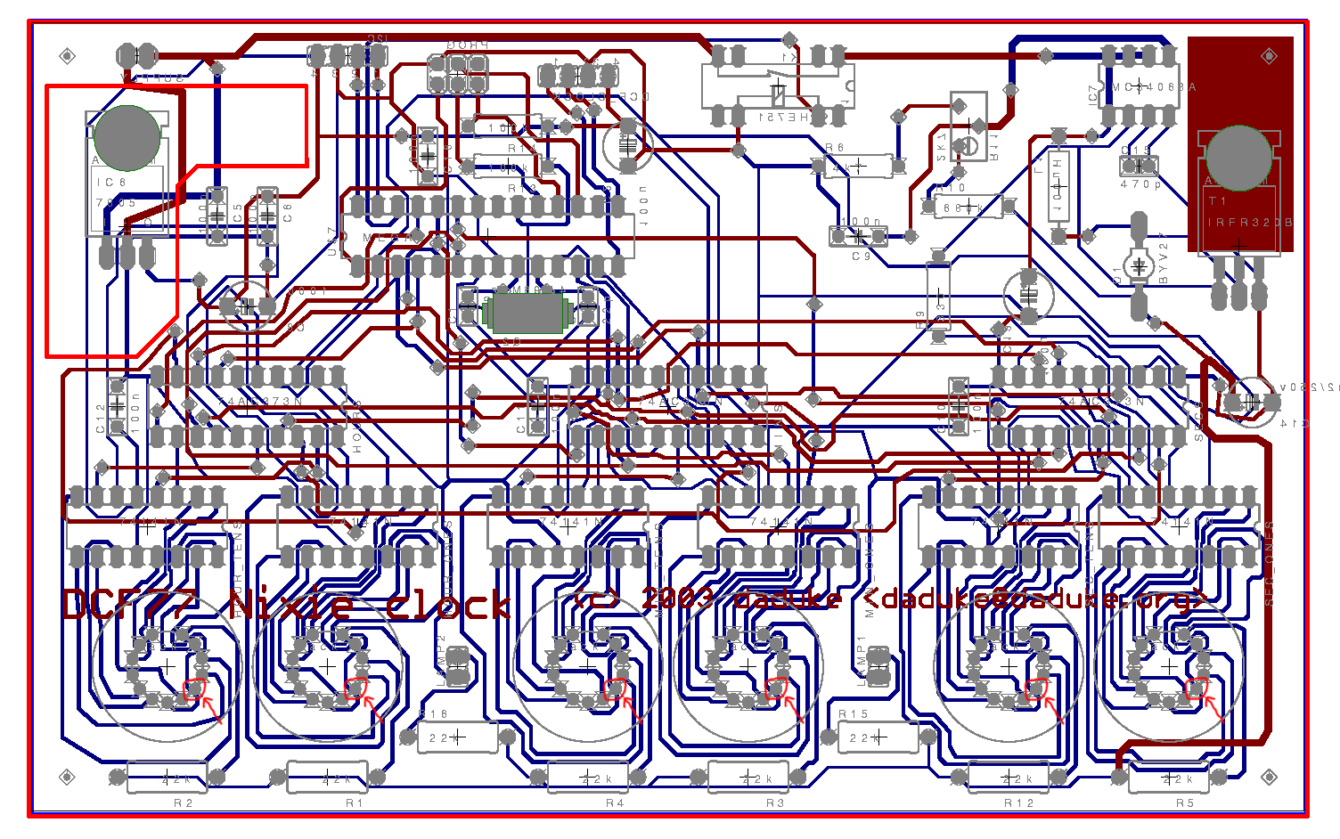 21.12.03: Important: I built a second clock and found a small oops in the PCB layout. The first batch of ZM1210 I got had no legs at pin 9 (second anode pin), so I used this pad as a via to pin 7 (digit 5). The ZM1210 I bought now do have this leg and it took me some time to find out why all digits were pulled low. So if nothing happens in your nixies check whether you have this pin and just cut it (I marked the place with red circles on the layout).